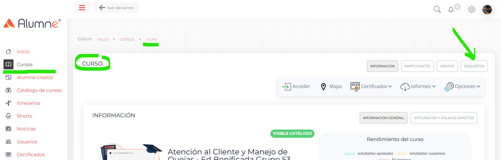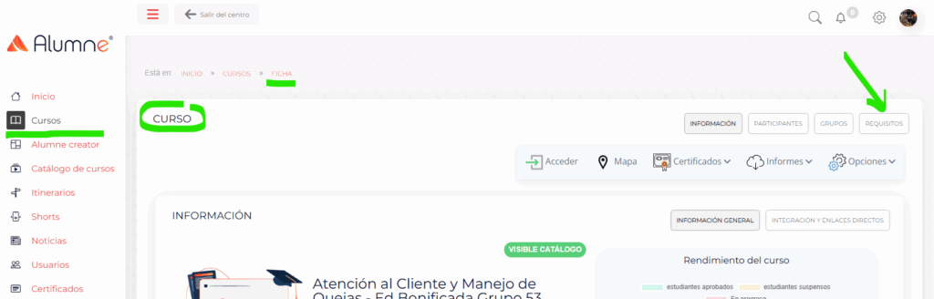 Se debe ir al curso en cuestión (CURSOS > Buscar el curso específico). Pinchar el título del curso para acceder a la ficha del curso, y una vez allí, ir a la pestaña que aparece en la zona superior derecha REQUISITOS.